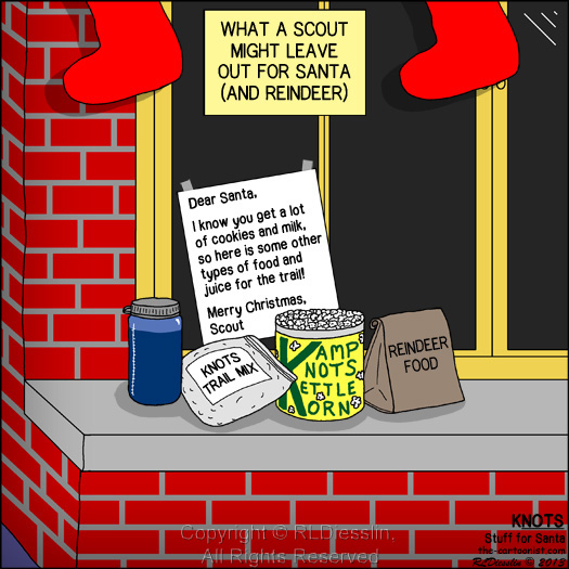 Copyright © 2013 Richard Diesslin, all rights reserved. This image is copyright protected and may not be used or reproduced in any form without the expressed written permission of the owner. Permission is usually granted for local troop/pack hardcopy newsletter use, but you need to ask (it's free)! Higher resolution images (color and black-and-white) and permissions are available with purchase of the KNOTS CD. Also the KNOTS Book and/or e-Book may be of interest! Licensing rights are also available for purchase. Thanks for your interest in KNOTS cartoons and your respect for our copyrights. Note: KNOTS Cartoons are not affiliated with the Boy Scouts of America or any other organization. |