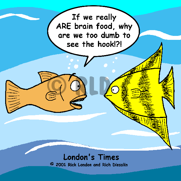 Are Fish Really Brain Food Other Shops Where Our Cartoon Products are Sold: Cafe Press Shops: OutToLunch2 | OTL1 | Knots Scout | Cartoon Gospel Cartoons are available in print resolution in any format. To license use of this cartoon refer to the Detailed Licensing Guidelines or, for your convenience use this Cartoon Licensing Quick List: