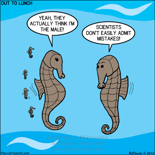 Stubborn Science and the Seahorse Dilemma May 9, 2012 Other Shops Where Our Cartoon Products are Sold: Cafe Press Shops: OutToLunch2 | OTL1 | Knots Scout | Cartoon Gospel Cartoons are available in print resolution in any format. To license use of this cartoon refer to the Detailed Licensing Guidelines or, for your convenience use this Cartoon Licensing Quick List: