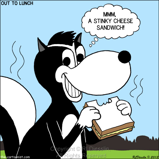 Skunk Favorites - Stinky Cheese Sandwich August 22, 2012 Other Shops Where Our Cartoon Products are Sold: Cafe Press Shops: OutToLunch2 | OTL1 | Knots Scout | Cartoon Gospel Cartoons are available in print resolution in any format. To license use of this cartoon refer to the Detailed Licensing Guidelines or, for your convenience use this Cartoon Licensing Quick List: