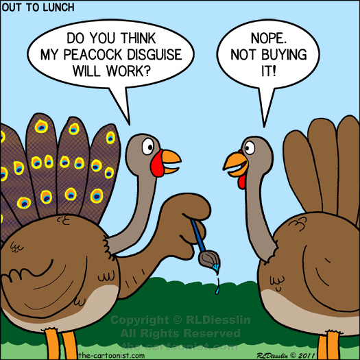 Turkey Tactics November 21, 2012 Other Shops Where Our Cartoon Products are Sold: Cafe Press Shops: OutToLunch2 | OTL1 | Knots Scout | Cartoon Gospel Cartoons are available in print resolution in any format. To license use of this cartoon refer to the Detailed Licensing Guidelines or, for your convenience use this Cartoon Licensing Quick List: