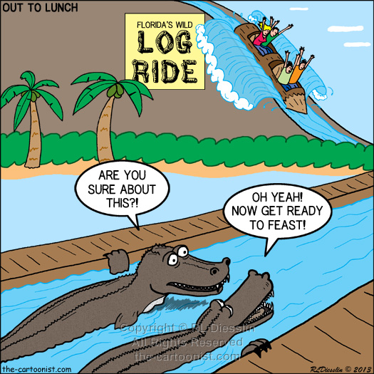 Alligator Dinner Plans February 20, 2013 Other Shops Where Our Cartoon Products are Sold: Cafe Press Shops: OutToLunch2 | OTL1 | Knots Scout | Cartoon Gospel Cartoons are available in print resolution in any format. To license use of this cartoon refer to the Detailed Licensing Guidelines or, for your convenience use this Cartoon Licensing Quick List: