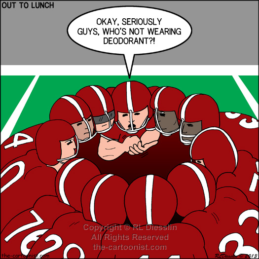 Football Huddle Odor November 13, 2013 Keywords: Football, Huddle, Body Odor, Deodorant Other Shops Where Our Cartoon Products are Sold: Cafe Press Shops: OutToLunch2 | OTL1 | Knots Scout | Cartoon Gospel Cartoons are available in print resolution in any format. To license use of this cartoon refer to the Detailed Licensing Guidelines or, for your convenience use this Cartoon Licensing Quick List: