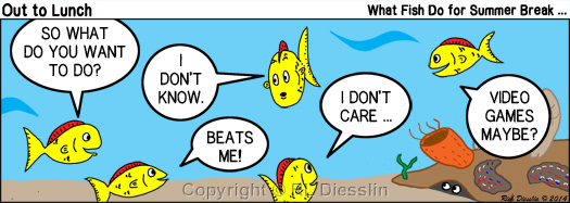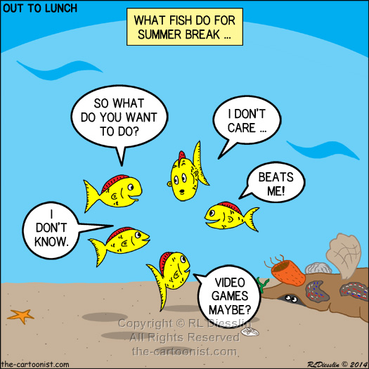 What Fish Do When School is Out August 13, 2014 Keywords: otl cartoon, Diesslin, fish, school, video games, indecision Other Shops Where Our Cartoon Products are Sold: Cafe Press Shops: OutToLunch2 | OTL1 | Knots Scout | Cartoon Gospel Cartoons are available in print resolution in any format. To license use of this cartoon refer to the Detailed Licensing Guidelines or, for your convenience use this Cartoon Licensing Quick List: