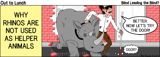 Why Rhinos are Not Used as Helper Animals September 10, 2014 Keywords: otl cartoon, Diesslin, rhino, animals, rhinoceros, blind, seeing impaired Other Shops Where Our Cartoon Products are Sold: Cafe Press Shops: OutToLunch2 | OTL1 | Knots Scout | Cartoon Gospel Cartoons are available in print resolution in any format. To license use of this cartoon refer to the Detailed Licensing Guidelines or, for your convenience use this Cartoon Licensing Quick List: