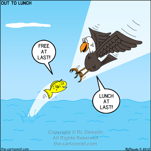Fish and Bird Perspectives August 12, 2015 Keywords: otl cartoon, Diesslin, Out to Lunch Cartoon, fish, bird, ocean Other Shops Where Our Cartoon Products are Sold: Cafe Press Shops: OutToLunch2 | OTL1 | Knots Scout | Cartoon Gospel Cartoons are available in print resolution in any format. To license use of this cartoon refer to the Detailed Licensing Guidelines or, for your convenience use this Cartoon Licensing Quick List: