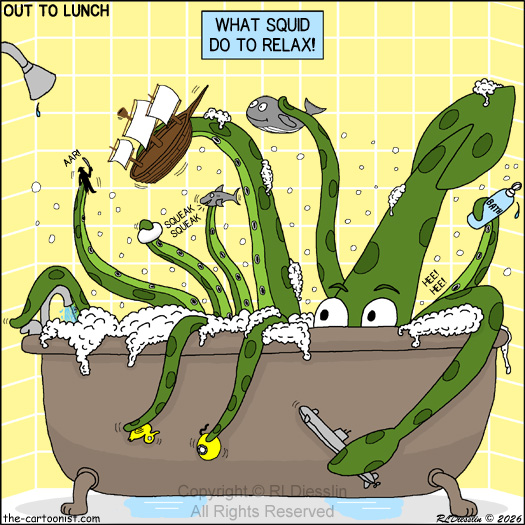 Squid Bubble Bath! It's what Squid do to relax of course! An Out to Lunch Cartoon by Rich Diesslin. ;) May 20, 2026 Redbubble | TeePublic | Cafe Press Keywords: OTL, Out to Lunch Cartoon, Diesslin, squid, bubble bath, toys, play, bathtub, hot bath. Copyright © 2026 Richard Diesslin. Other Shops Where Our Cartoon Products are Sold: Cafe Press Shops: OutToLunch2 | OTL1 | Knots Scout | Cartoon Gospel Cartoons are available in print resolution in any format. To license use of this cartoon refer to the Detailed Licensing Guidelines or, for your convenience use this Cartoon Licensing Quick List: